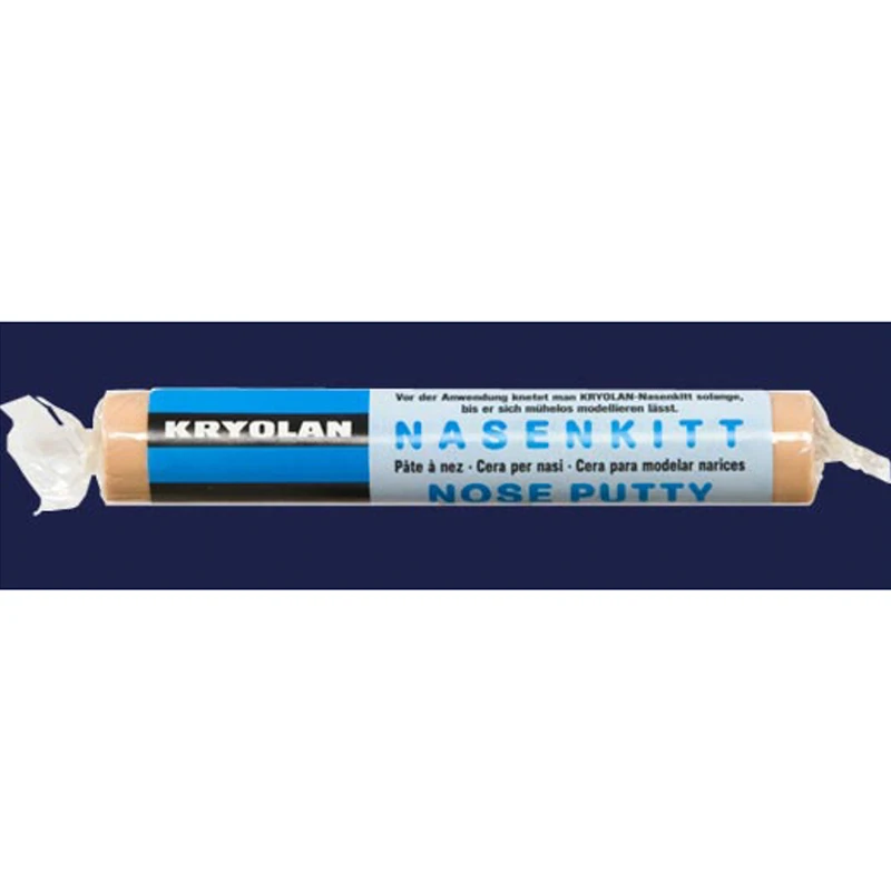 Nose Putty is a wax preparation for alterations of the natural nose form. The required amount of Nose Putty is kneaded between the fingers, with coarse preliminary modeling done with the model mounted on a finger knuckle. The fingers must first be moistened with a little water or gel to prevent undesirable adherence of the putty to the fingers. The small, preliminary wax model is then transferred onto the bridge of the nose, and the work is completed in the form of fine modeling. Before applying make-up, the wax part should be dabbed with Sealer.