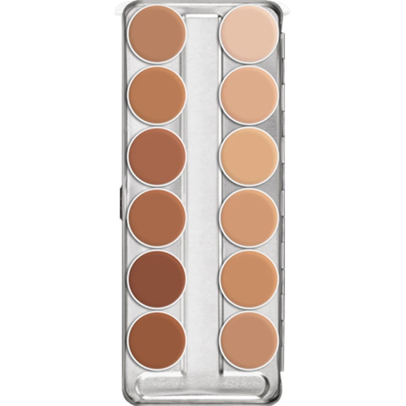 Rubber Mask Grease in una pratica palette. Rubber Mask Grease è un prodotto a base grassa d’eccezionale opacità ed aderenza. Il prodotto è l’ideale per colorare protesi in lattice come nasi artificiali, menti, ferite o calotte. I colori di questa palette possono essere sostituiti singolarmente con le cialde di ricambio. Per applicare uniformemente il prodotto inumidire la spugna con un po’ di alcol (es. con Spirit Gum Remover and Thinner). In questo modo Rubber Mask Grease consente un’applicazione uniforme, facile e persino sottile. Come gli altri Make-up a base grassa, Rubber Mask Grease andrebbe fissato con la cipria Traslucent Powder.